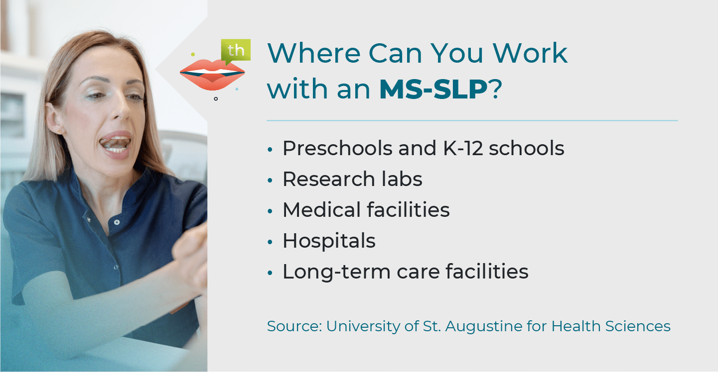 A Master of Science in Speech-Language Pathology (MS-SLP) gives you the tools to assist people with complications that affect their speech. Communication obstacles can come from a cleft palate, developmental delays, cognitive challenges and traumatic brain injuries. Patients who receive the help of a speech-language pathologist can gain greater independence and boost their self-confidence.