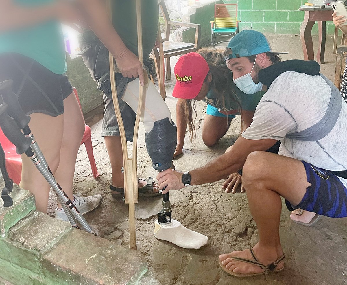 Assistant professor Todd Bourgeois, PT, DPT, PhD, organizes twice-yearly “surf & serve” mission trips to the rural coast of El Salvador, in which small groups of physical therapy faculty and students ride the waves and offer pro bono treatments to local patients. In late 2020, the group happened to meet “Javier” (not his real name), a middle-aged toll collector whose leg had been amputated below the knee after an infected cut threatened his life. Javier couldn’t return to work and provide for his family unless he could stand without crutches. He needed a prosthetic leg.