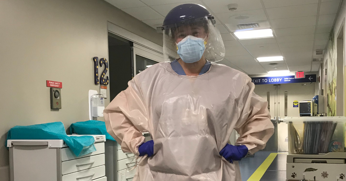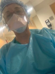 Concerned about the nationwide shortage of personal protective equipment (PPE), McMaster would don all her gear—gown, mask, goggles, face shield, two pairs of gloves—and stay in a patient’s room for up to two hours, using a baby monitor like a walkie-talkie to ask other nurses to retrieve items she needed. Nurses were fortunate to be allocated a new N95 mask each day. At one point, they received gowns made by Ford Motor Company that staff speculated were made from airbag material. “They were reusable and very protective, but also really hot and sweaty,” McMaster says. “They caused your mask and goggles to fog up.”