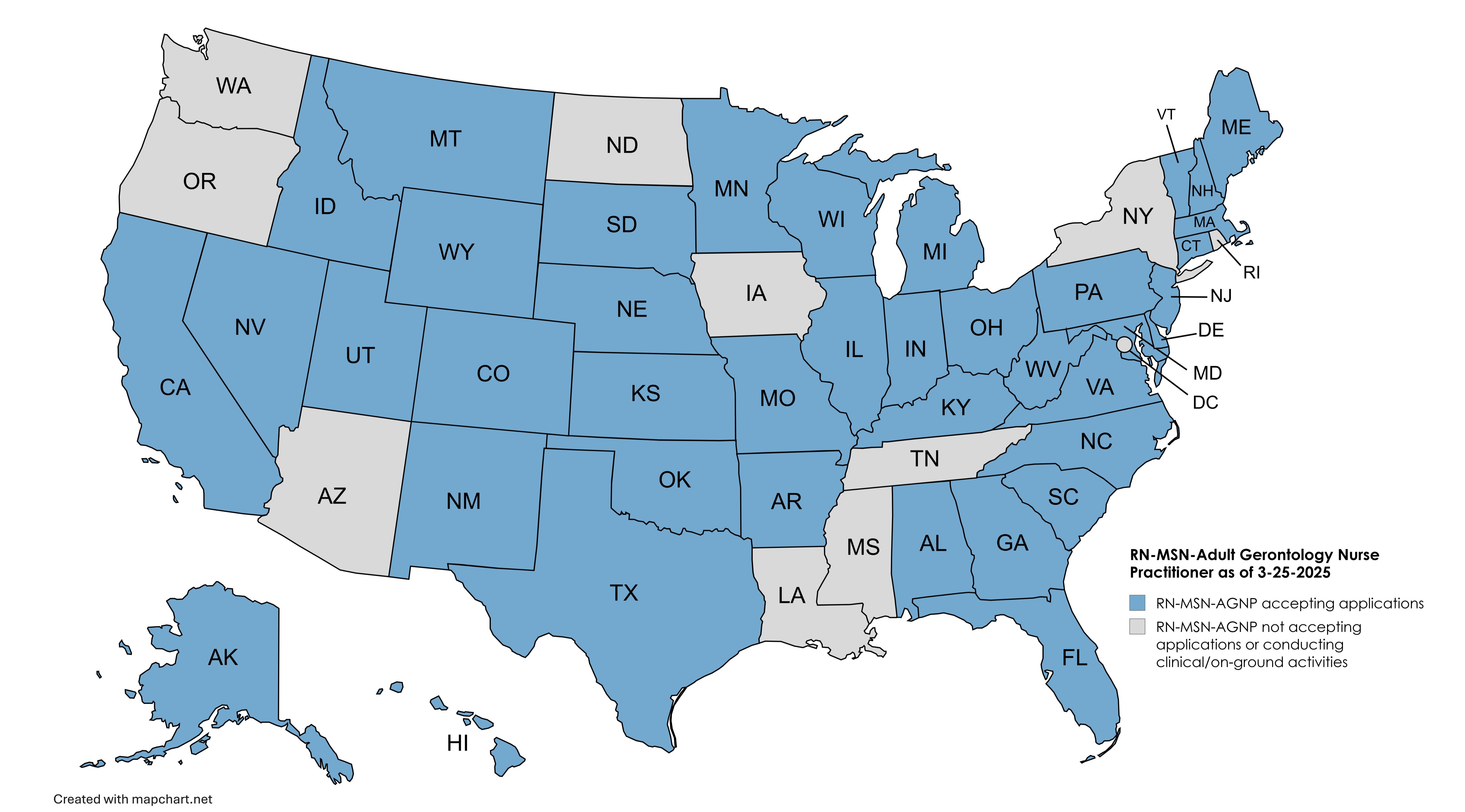 USAHS is currently accepting applications for enrollment in the Master of Science in Nursing program with Adult Gerontology Nurse Practitioner (MSN-AGNP) role specialty for residents in the following states: Alabama, Alaska, Arkansas, California, Colorado, Connecticut, Delaware, Florida, Georgia, Hawaii, Idaho, Illinois, Indiana, Iowa, Kansas, Kentucky, Maine, Maryland, Massachusetts, Michigan, Minnesota, Missouri, Montana, Nebraska, Nevada, New Hampshire, New Jersey, New Mexico, North Carolina, Ohio, Oklahoma, Oregon, Pennsylvania, South Carolina, South Dakota, Texas, Utah, Vermont, Virginia, Washington, West Virginia, Wisconsin and Wyoming.