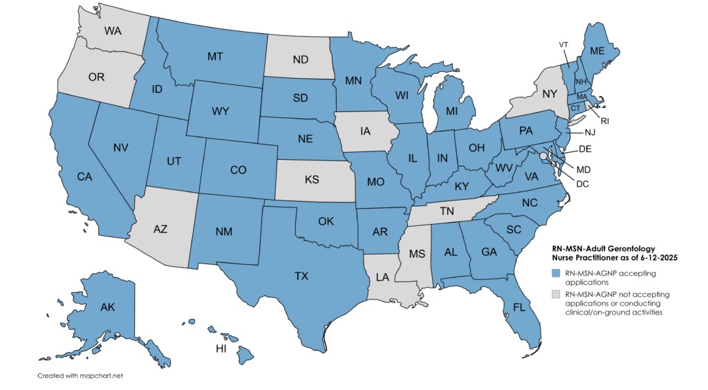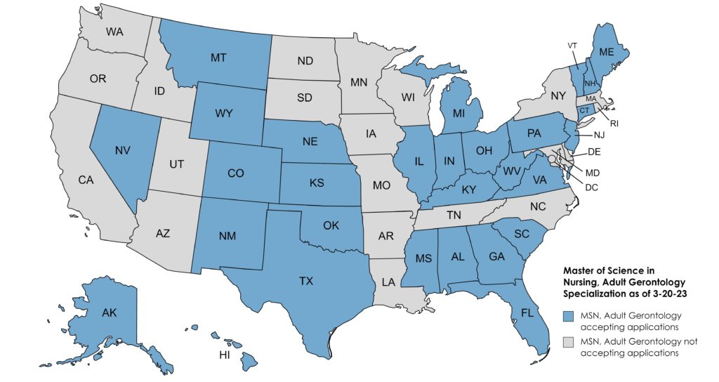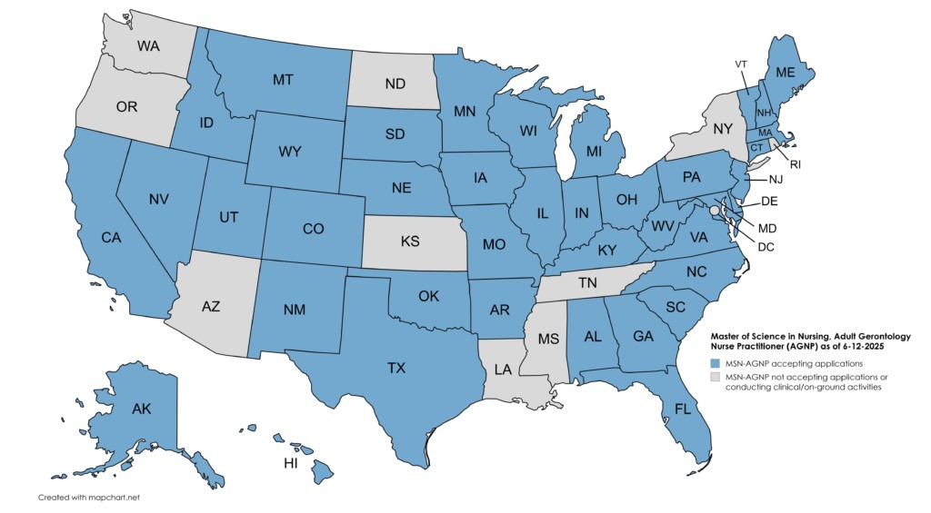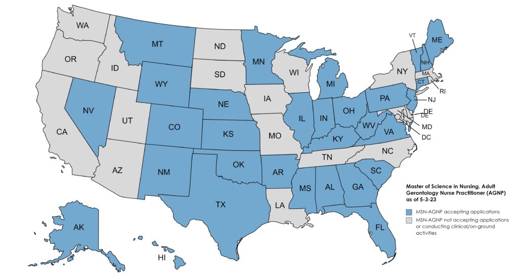 USAHS is currently accepting applications for enrollment in the Master of Science in Nursing program with Adult Gerontology Nurse Practitioner (MSN-AGNP) role specialty for residents in the following states: Alabama, Alaska, Arkansas, California, Colorado, Connecticut, Delaware, Florida, Georgia, Hawaii, Idaho, Illinois, Indiana, Iowa, Kansas, Kentucky, Maine, Maryland, Massachusetts, Michigan, Minnesota, Missouri, Montana, Nebraska, Nevada, New Hampshire, New Jersey, New Mexico, North Carolina, Ohio, Oklahoma, Oregon, Pennsylvania, South Carolina, South Dakota, Texas, Utah, Vermont, Virginia, Washington, West Virginia, Wisconsin and Wyoming.