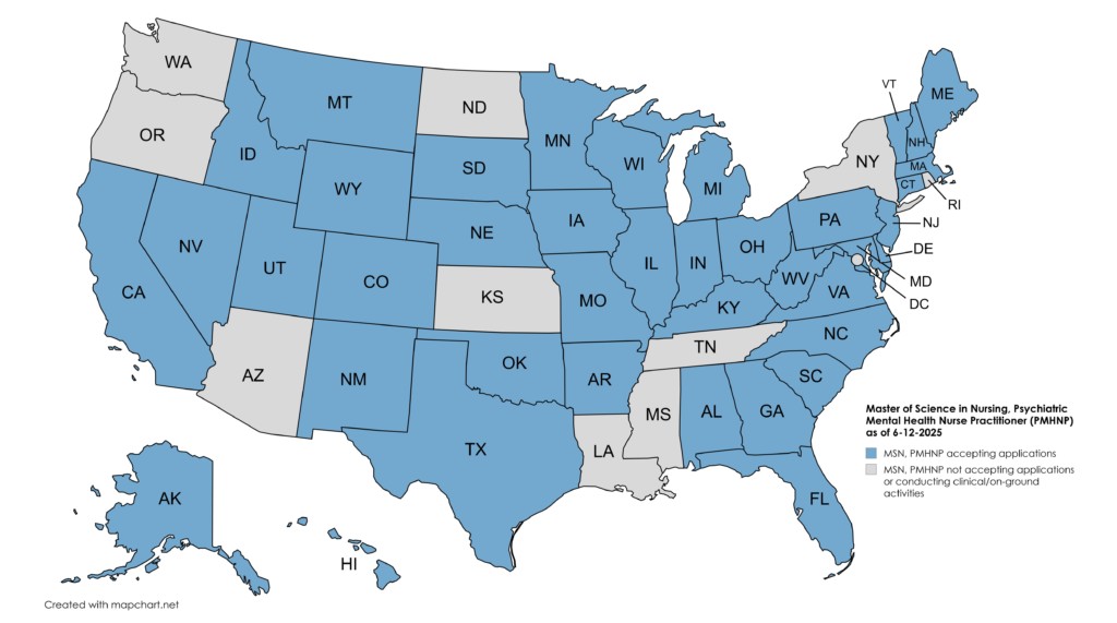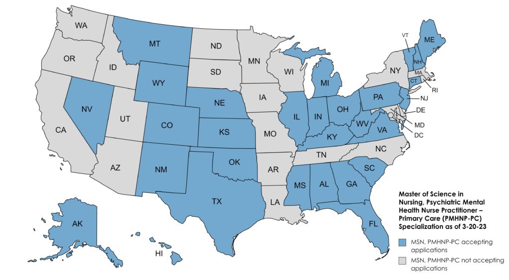 USAHS is currently accepting applications for enrollment in the Master of Science in Nursing program with Psychiatric Mental Health Nurse Practitioner (MSN-PMHNP) role specialty for residents in the following states: Alabama, Alaska, Arkansas, California, Colorado, Connecticut, Delaware, Florida, Georgia, Hawaii, Idaho, Illinois, Indiana, Iowa, Kansas, Kentucky, Maine, Maryland, Massachusetts, Michigan, Minnesota, Missouri, Montana, Nebraska, Nevada, New Hampshire, New Jersey, New Mexico, North Carolina, Ohio, Oklahoma, Oregon, Pennsylvania, South Carolina, South Dakota, Texas, Utah, Vermont, Virginia, Washington, West Virginia, Wisconsin and Wyoming.