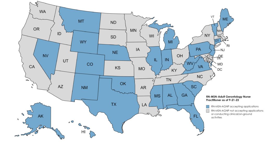 USAHS is currently accepting applications for enrollment in the RN to Master of Science in Nursing program with Adult Gerontology Nurse Practitioner (RN to MSN-AGNP) role specialty for residents in the following states: Alaska, Alabama, Arkansas, California, Colorado, Connecticut, Delaware, Florida, Georgia, Hawaii, Idaho, Illinois, Indiana, Iowa, Kansas, Maine, Massachusetts, Michigan, Minnesota, Missouri, Montana, Nebraska, Nevada, New Jersey, New Mexico, New Hampshire, North Carolina, Ohio, Oklahoma, Oregon, Pennsylvania, South Carolina, South Dakota, Texas, Utah, Vermont, Virginia, Washington, West Virginia, Wisconsin and Wyoming.