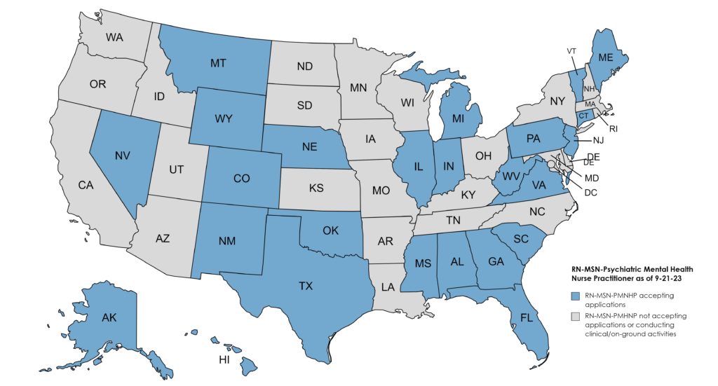The map below identifies the states from which the University is now accepting applications for the RN to MSN-PMHNP program. For states denoted in blue, USAHS has determined the program satisfies the educational requirements for professional licensure in those states. USAHS has not made a determination regarding whether the RN to MSN-PMHNP program satisfies the educational requirements for professional licensure in the states denoted in gray.
