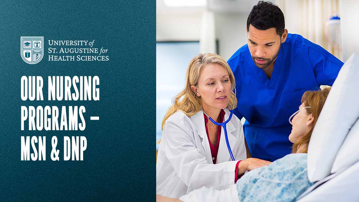 Notice to State of Washington Students: The University of St. Augustine for Health Sciences is approved by the Washington State Board of Nursing to conduct practice experiences for residents of Washington state for the MSN/Nurse Educator, MSN/Nurse Executive, MSN/FNP,  MSN/AGNP, MSN/PMHNP, RN-MSN/FNP, RN-MSN/AGNP, RN-MSN/PMHNP, MSN-entry DNP, DNP/Nurse Executive, DNP/FNP, Post-Graduate Nursing Certificate (PMHNP), and Post-Graduate Nursing Certificate (FNP) program tracks. Learn more.