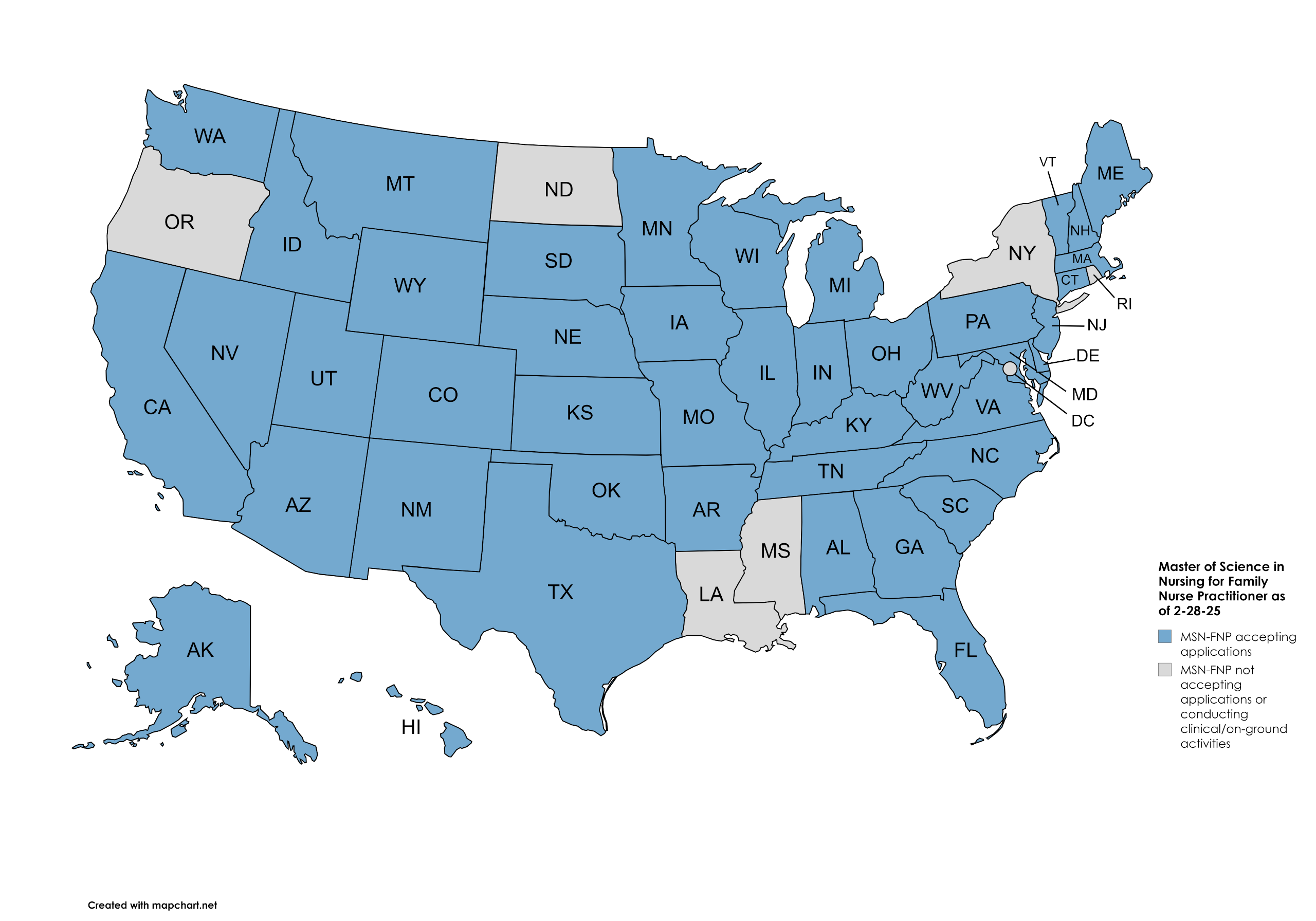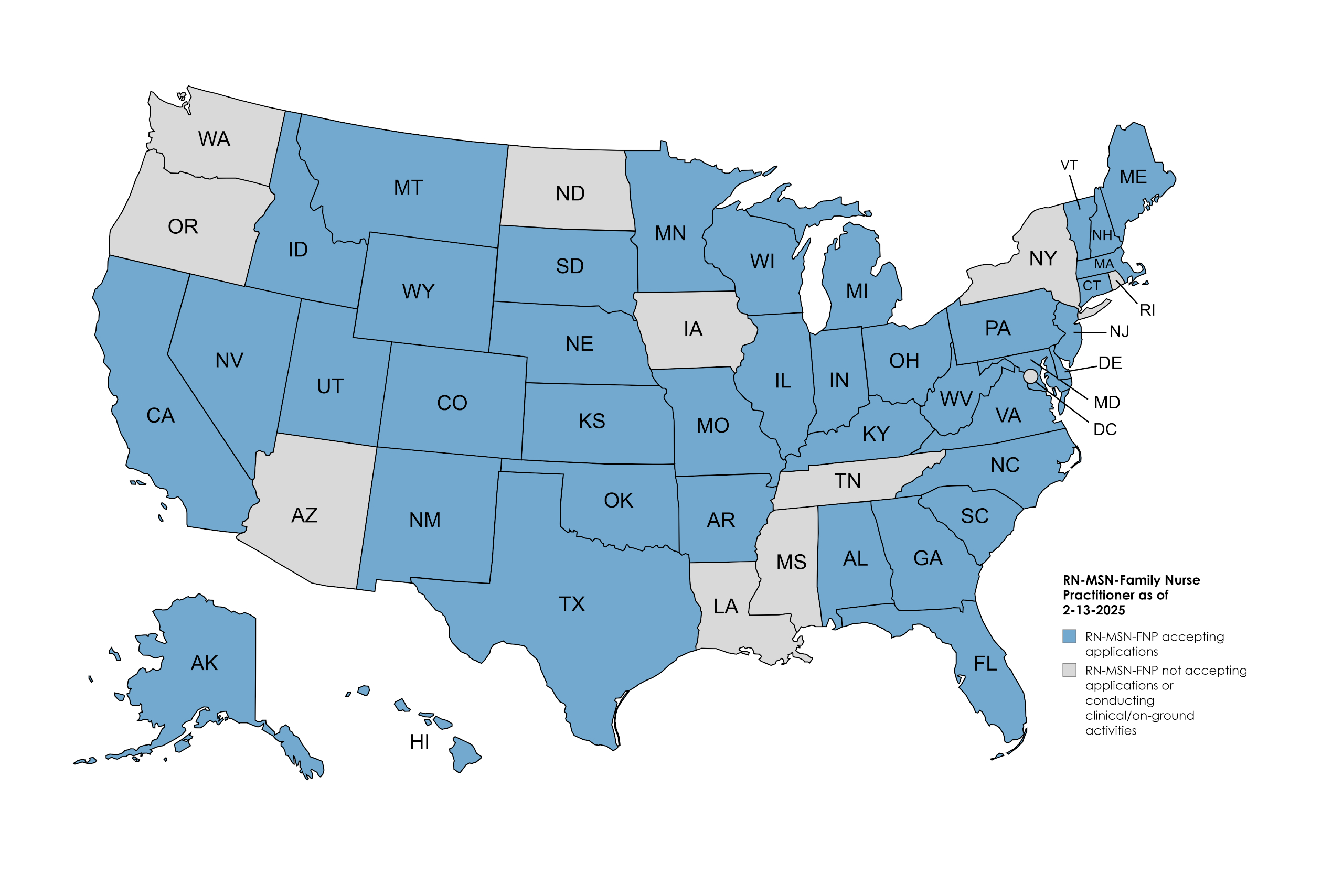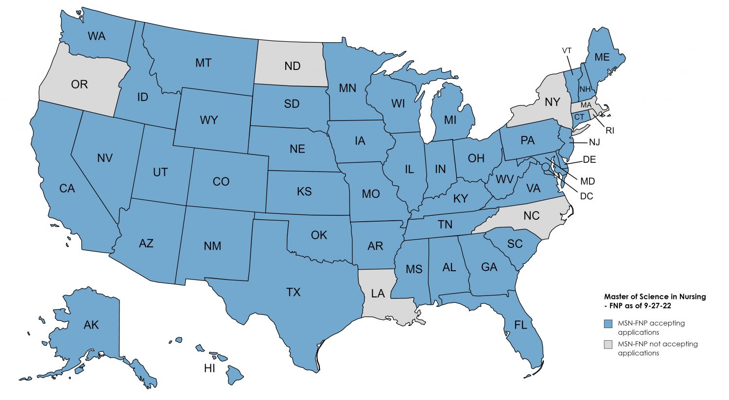 The map below identifies the states from which the University is now accepting applications for the RN to MSN-AGNP program. For states denoted in blue, USAHS has determined the program satisfies the educational requirements for professional licensure in those states. USAHS has not made a determination regarding whether the RN to MSN-AGNP program satisfies the educational requirements for professional licensure in the states denoted in gray.