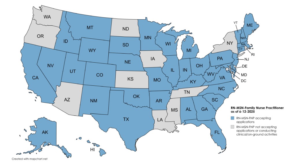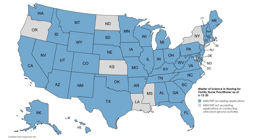 USAHS is currently accepting applications for enrollment in the Master of Science in Nursing program with Family Nurse Practitioner (MSN-FNP) role specialty for residents in the following states: Alabama, Alaska, Arizona, Arkansas, California, Colorado, Connecticut, Delaware, Florida, Georgia, Hawaii, Illinois, Indiana, Idaho, Iowa, Kansas, Kentucky, Maine, Maryland, Massachusetts, Michigan, Minnesota, Missouri, Montana, Nebraska, New Hampshire, New Jersey, New Mexico, Nevada, North Carolina, Oklahoma, Ohio, Oregon, Pennsylvania, South Carolina, South Dakota, Tennessee, Texas, Utah, Vermont, Virginia, Washington, West Virginia, Wisconsin and Wyoming.