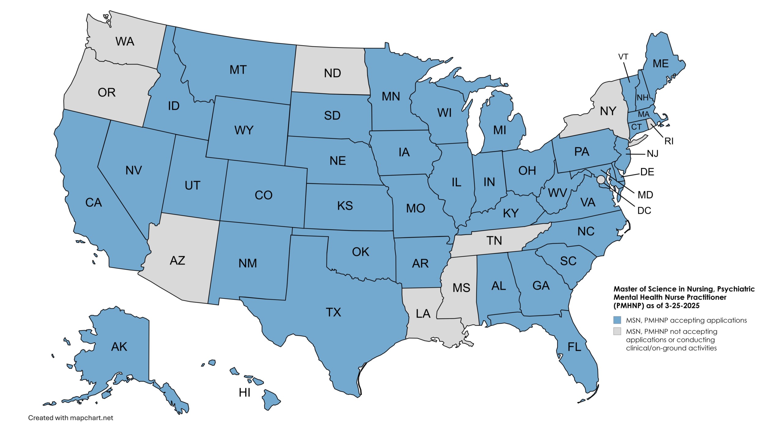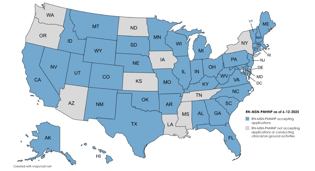 The map below identifies the states from which the University is now accepting applications for the MSN-PMHNP program. For states denoted in blue, USAHS has determined the program satisfies the educational requirements for professional licensure in those states. USAHS has not made a determination regarding whether the MSN-PMHNP program satisfies the educational requirements for professional licensure in the states denoted in gray.