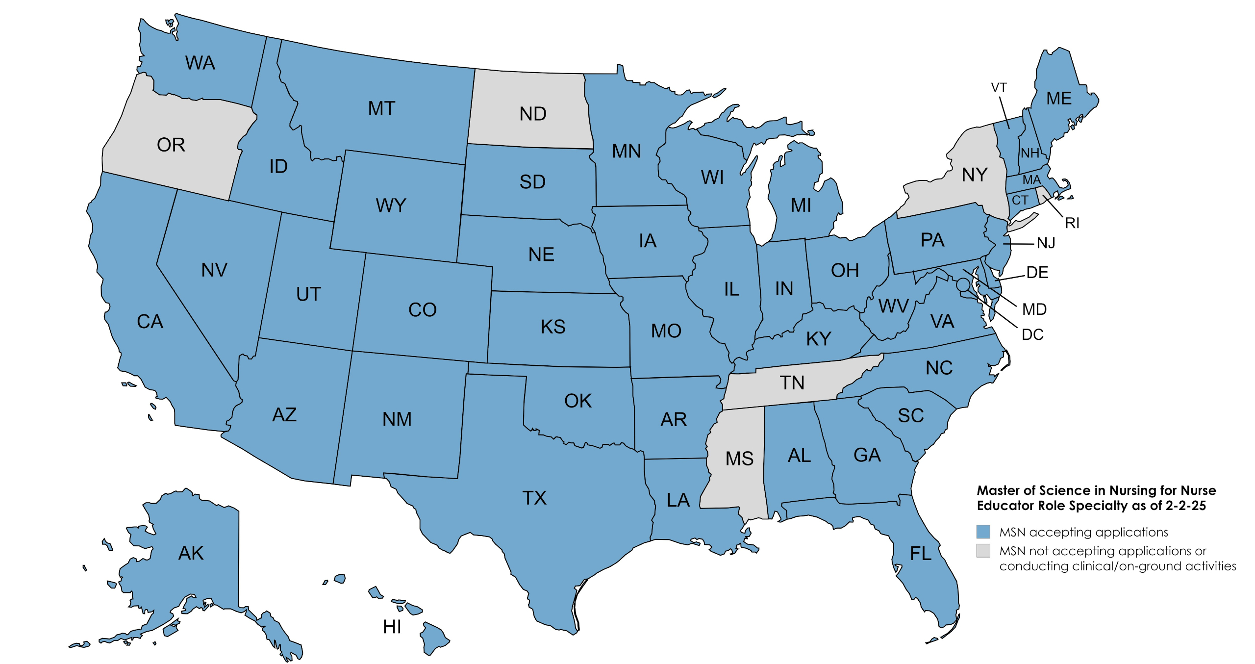 The map below identifies the states from which the University is now accepting applications for the MSN Nurse Educator program (indicated in blue).