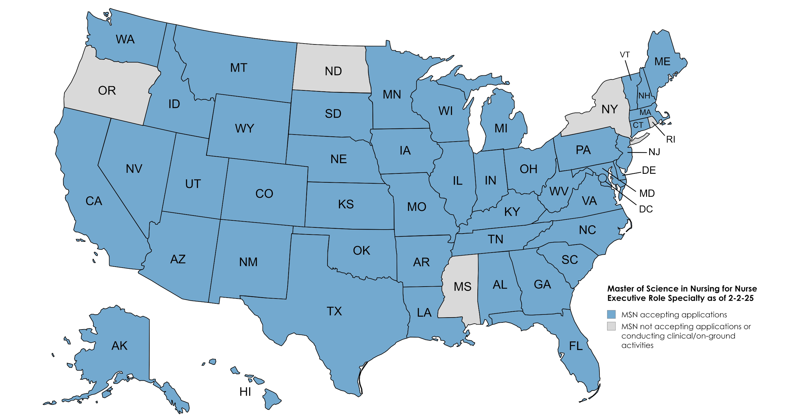 The map below identifies the states from which the University is now accepting applications for the MSN Nurse Executive program (indicated in blue).