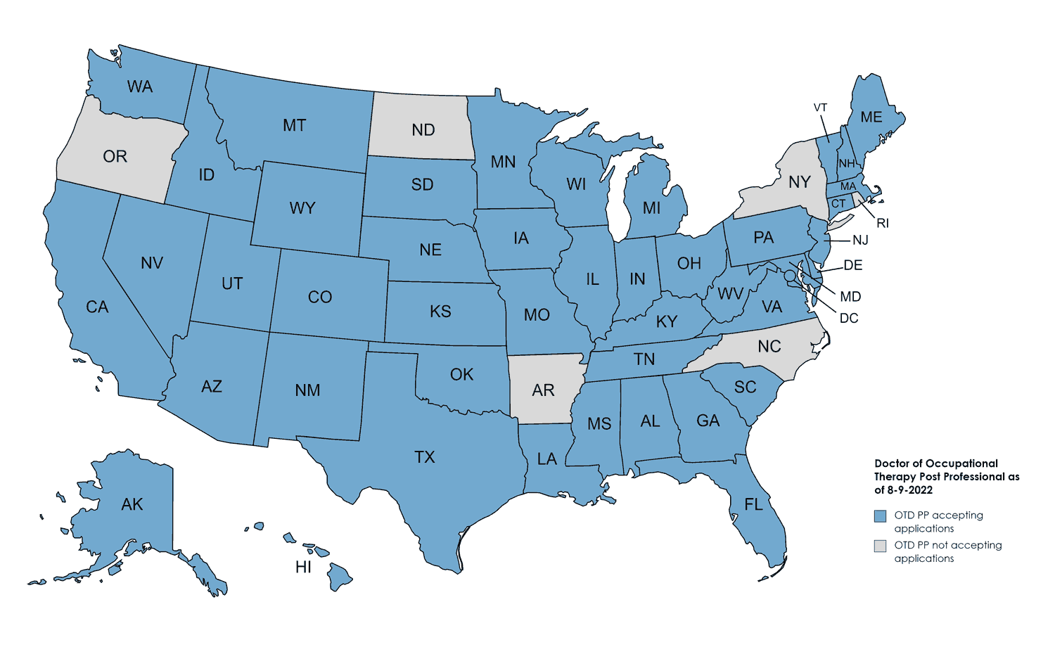 USAHS currently is accepting applications for enrollment in the 27-credit hour Master’s-level entry PPOTD program for residents of the following states: Alabama, Alaska, Arizona, California, Colorado, Connecticut, Delaware, District of Columbia, Florida, Georgia, Hawaii, Idaho, Illinois, Indiana, Iowa, Kansas, Kentucky, Louisiana, Maine, Maryland, Massachusetts, Michigan, Missouri, Minnesota, Montana, Nebraska, Nevada, New Hampshire, New Jersey, New Mexico, Ohio, Oklahoma, Pennsylvania, South Carolina, South Dakota, Tennessee, Texas, Utah, Vermont, Virginia, Washington, West Virginia, Wisconsin and Wyoming.