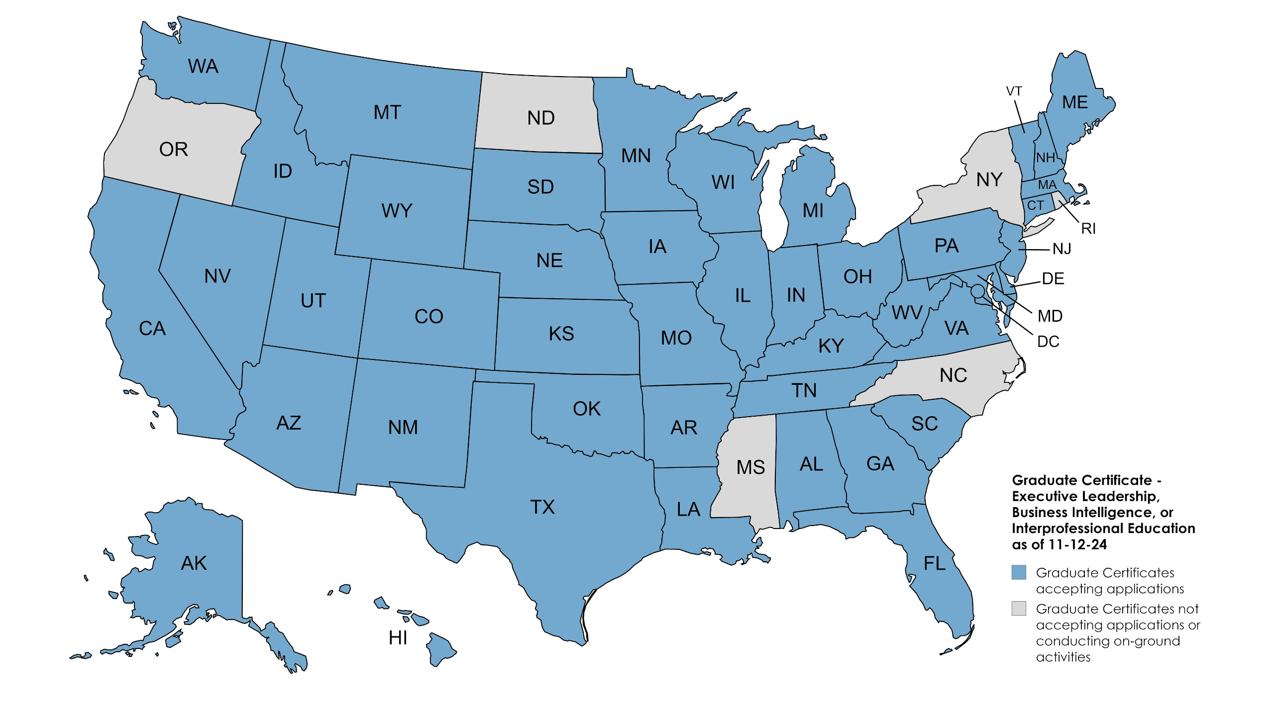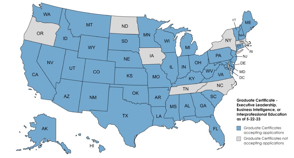 The map below identifies the states from which the University is now accepting applications for the Graduate Certificates in Executive Leadership, Business Intelligence, and Interprofessional Education (indicated in blue).
